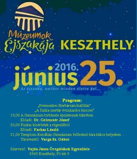 A Vajda János Öregdiákok Egyesülete mint egyik szervező részt vett a 2016.június 25-én tartott "Múzeumok Éjszakája" városi rendezvénysorozatban.