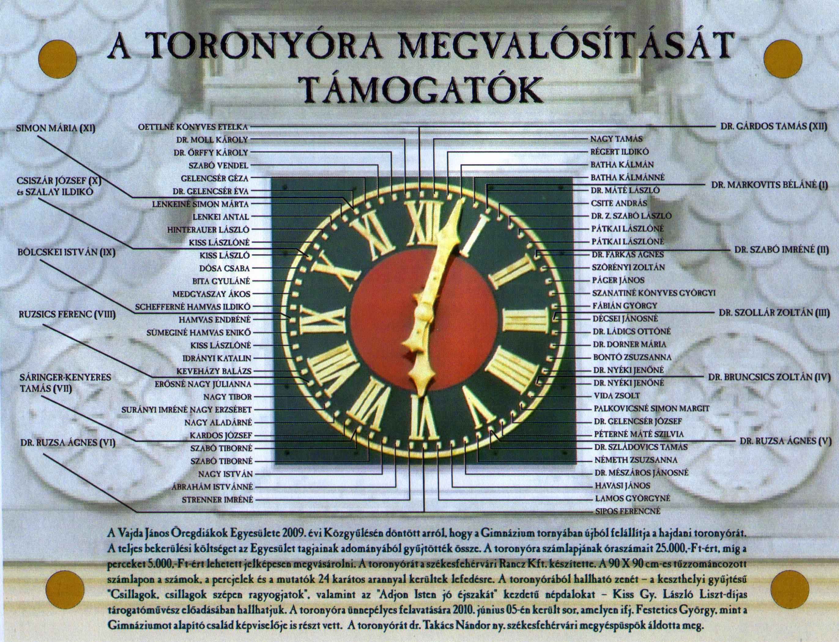 | "Az óráról azt kell tudni, hogy kilencvenszer kilencven cm széles, tűzzománcozott óra lappal rendelkezik, a mutatók és számok pedig valódi 24 karátos arannyal vannak aranyozva. Egyelőre reggel 8-kor és délben 12-kor lehet hallani a keszthelyi gyűjtésű „Csillagok-csillagok szépen ragyogjatok” (Bartók Béla keszthelyi gyűjtése) című magyar népdalt, és este 18 órakor az „Adjon isten jóéjszakát” (Kodály Zoltán zalai gyűjtése) című népdalt. A különlegessége a zenének az , hogy Kiss Gy. László Liszt díjas tárogató művész, tárogatón játszotta ezt fel Budapesten, egy stúdióban, és nagy örömünkre szolgál , hogy a hangosítás is jól sikerült , mert a forgalom ellenére is szépen lehet hallani." (Dr. Gárdos Tamás) A gimnázium toronyórájának felállítását diáktársaink adományaiból valósítottuk meg. Egyesületünk egy táblát avatott a gimnáziumban 2011. június 4-én, melyen látható, hogy kik támogatták a toronyóra újbóli felállítását. A toronyóra zenéje reggel 8-kor és déli 12 órakor A toronyóra zenéje 18 órakor